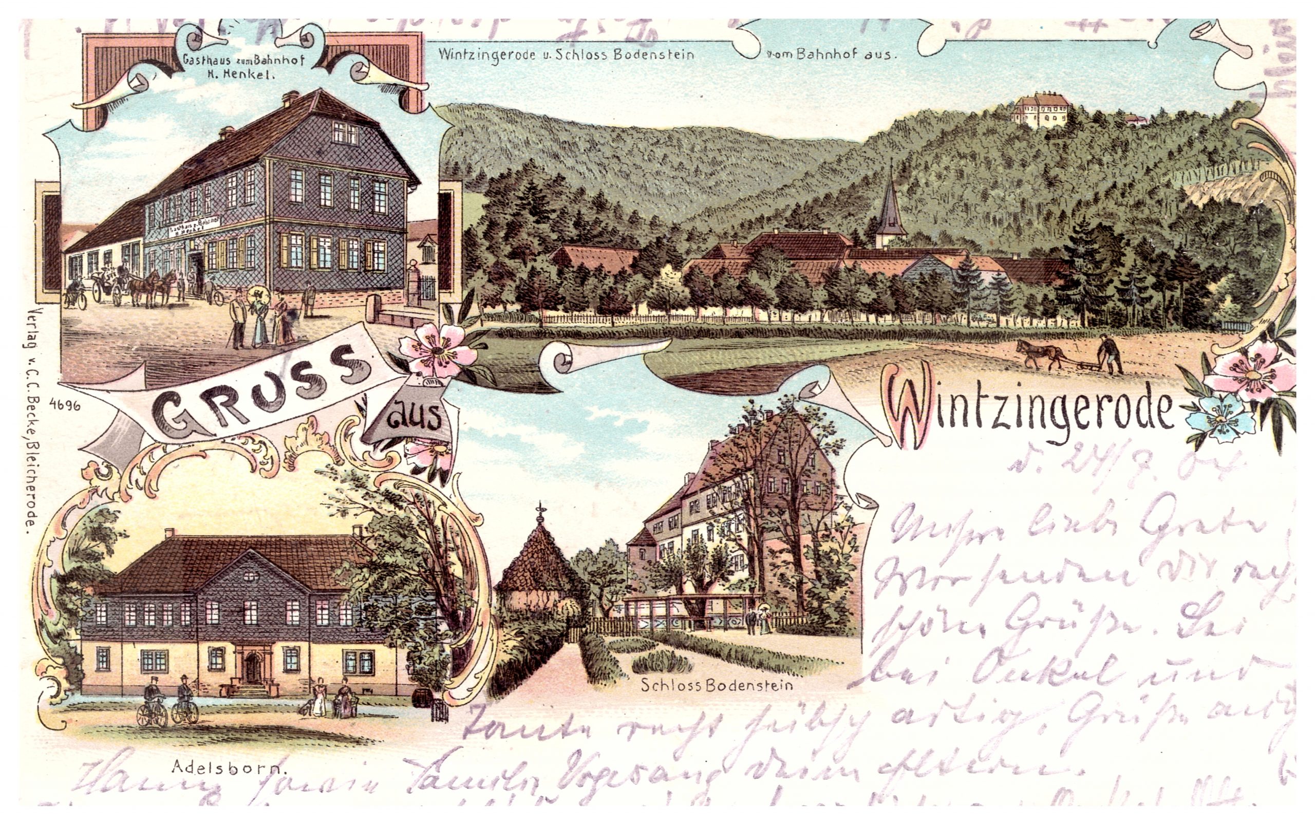 Abzug einer alten PostkarteDorfstrasse in Wintzingerodeum 1930: Wintzingeröder Dorfstrasse mit Schloss BodensteinBurg Bodenstein koloriert (1840)Schloss Bodenstein (Lithographie, Carl Duval, 19. Jahrhundert)Ferien- und Schulungszentrum der VEB Eichsfelder Zementwerke DeunaGaststätte BodensteinGruß aus WintzingerodeNaherholung FranzensruheNaherholung Gaststätte BodensteinNaherholungszentrum Gaststätte BodensteinBurg Bodenstein mit Zugbrücke